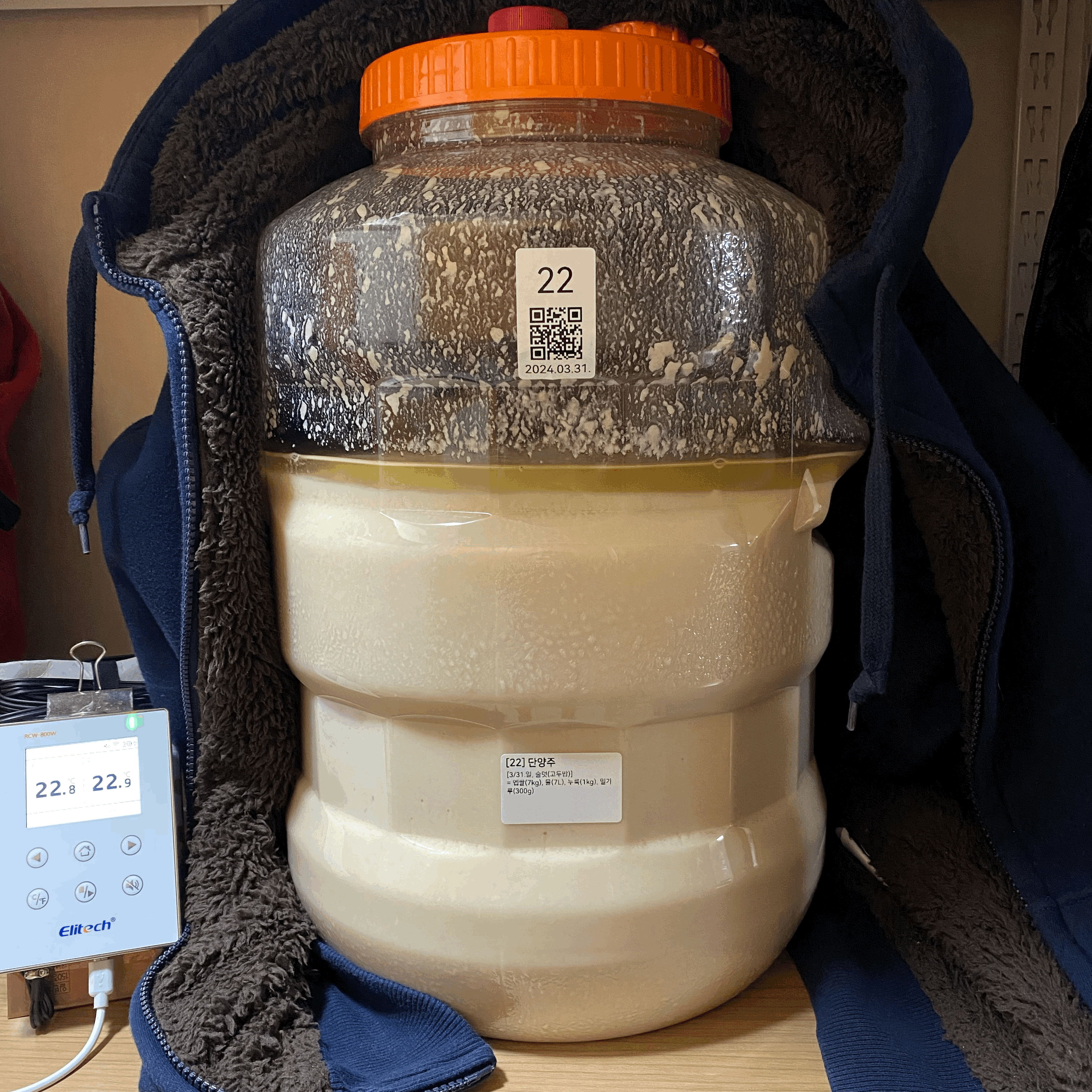냉각 완료된 술덧의 표면 상태. 품온이 15.9℃인데도 기포가 간간이 올라오고 있음. 사진에서 어두운 부분은 술독 입구의 그림자.냉각 완료된 술덧의 옆면 상태. 라벨 위치 쯤 까지는 소독용 알코올로 적신 면포로 닦아줌. 술독 뚜껑은 꽉 닫고, 위에 작은 뚜껑은 이산화탄소가 빠져나가기 위해 살짝 유격이 있을 정도만 조금 풀어둠.