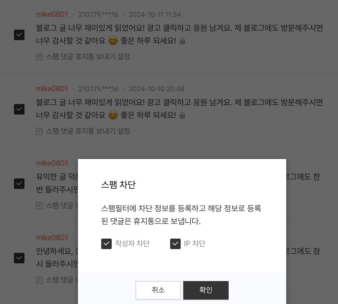 오늘도 스팸 댓글이 자동 분류되었다. (일부 정보는 마스킹했다.)