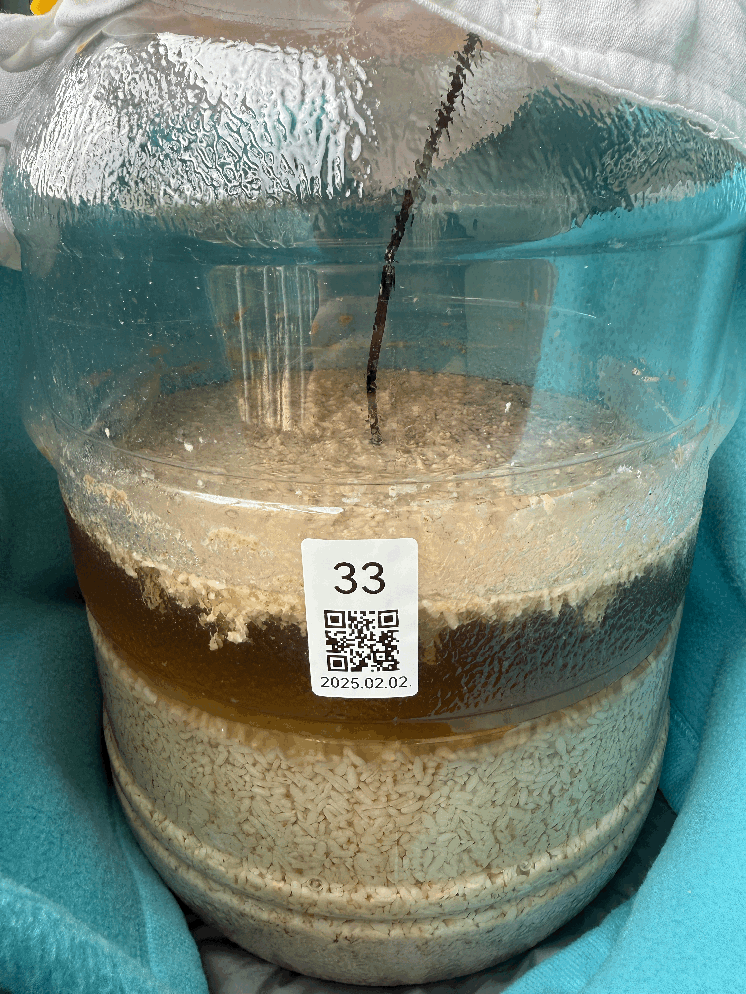 - 2025.02.17.월.22:30 (수곡 +2주 1일 6시간반) → 밑술 발효: 품온 34.7℃, 발효공간 25.0℃, 술독무게 10.09kg