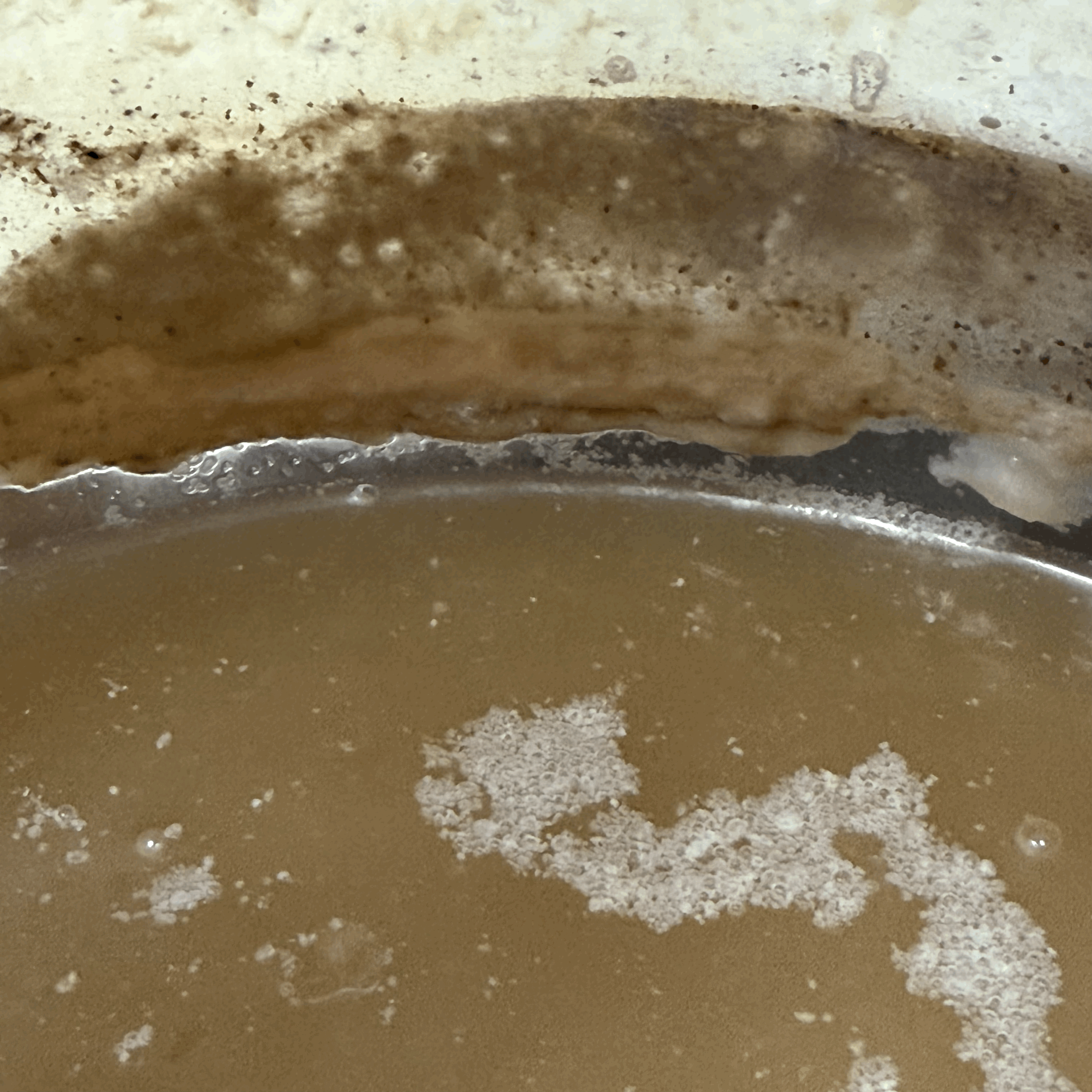- 밑술의 옆모습만 봤을 땐 문제 없어보였는데, 술독을 열어보니 술독 옆면이 잡균에 오염되었고, 심지어 냄새도 부패된 냄새가 난다.
