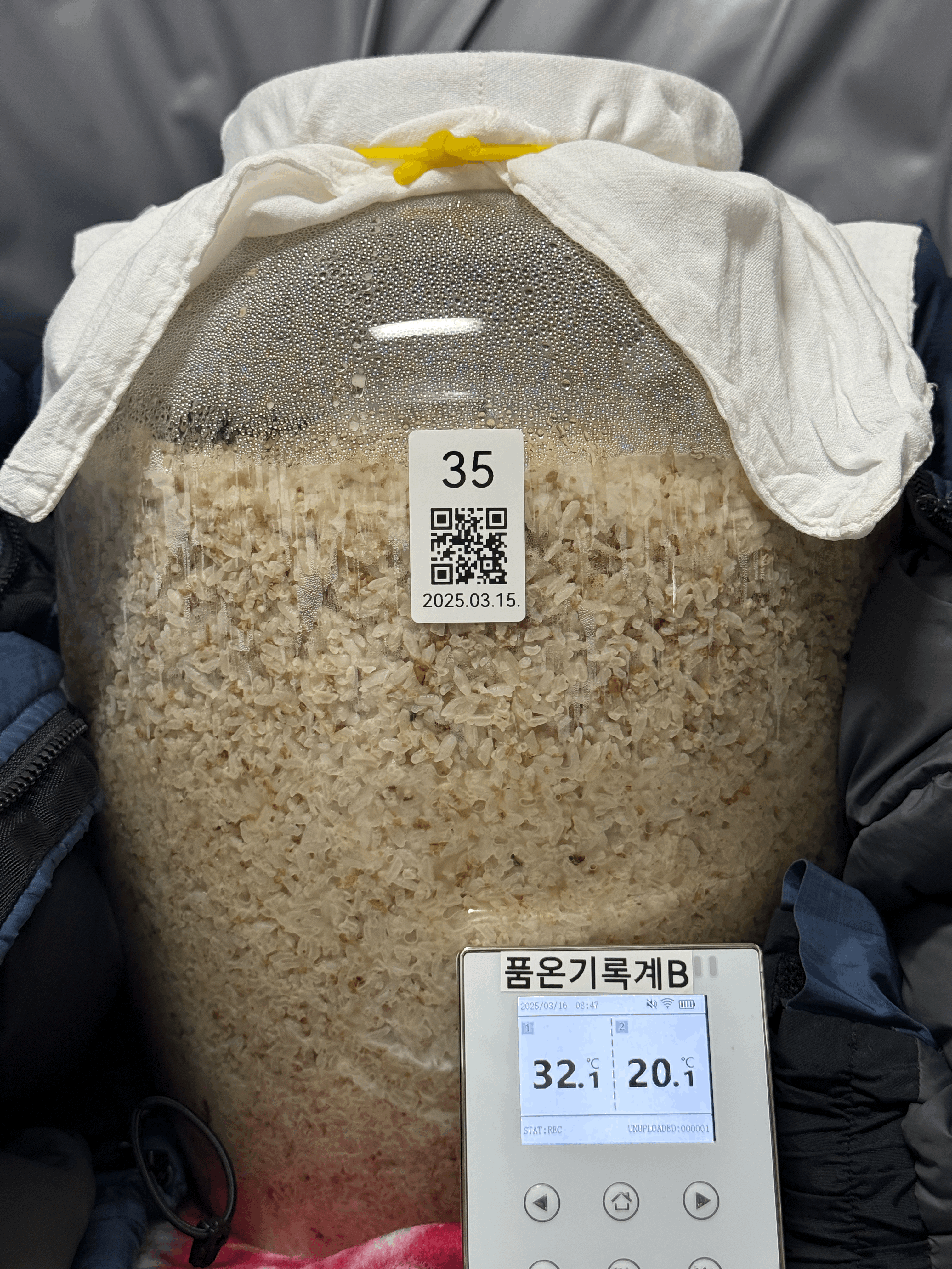 고두밥의 중심부 품온은 30℃ 수준으로 식혀 쓴다. 고두밥의 주변부 품온은 중심부보다 더 낮을테고, 실온의 수곡, 실온의 생수(2.5L)와 고두밥을 함께 섞으면 결국 술덧의 품온은 더 식어 25℃ 전후로 식을 것이다. 참고로, 우리 집의 요즘 실온은 21~23℃ 수준이다.
