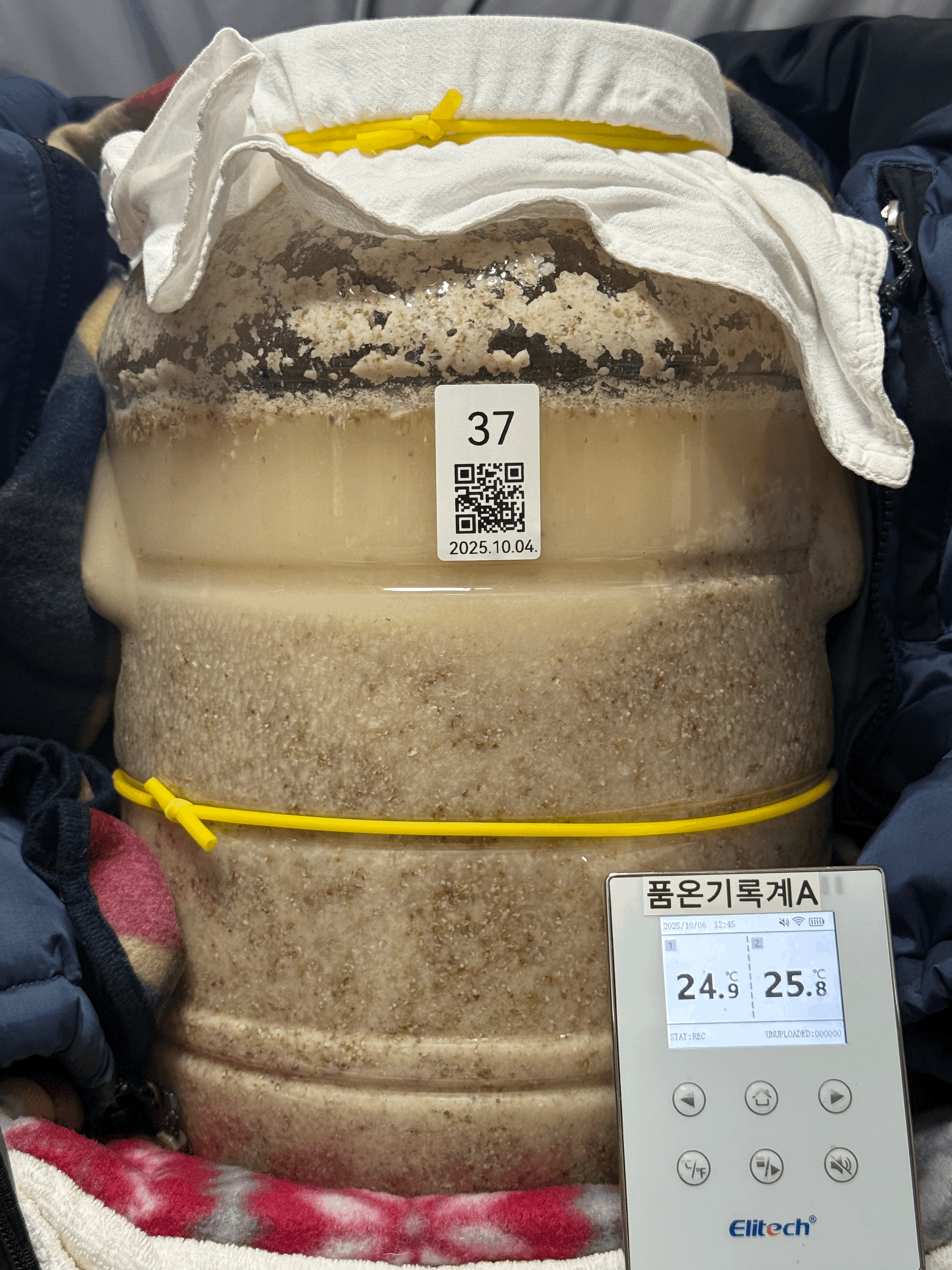 품온이 34.5℃까지 올랐길래 보쌈했던 다운 패딩을 벗겨 술독 옆면을 만져보니 미지근했다. 찹쌀이 아닌 멥쌀이다보니 당화를 좀 더 진행시키는 편이 좋을 것 같아 술덧의 품온이 너무 높지는 않은 채로 좀 더 유지할 목적으로 패딩을 벗기고 보냉백 지퍼를 완전히 열고 빛 차단을 위해 얇은 무릎 담요만 덮어줬다.