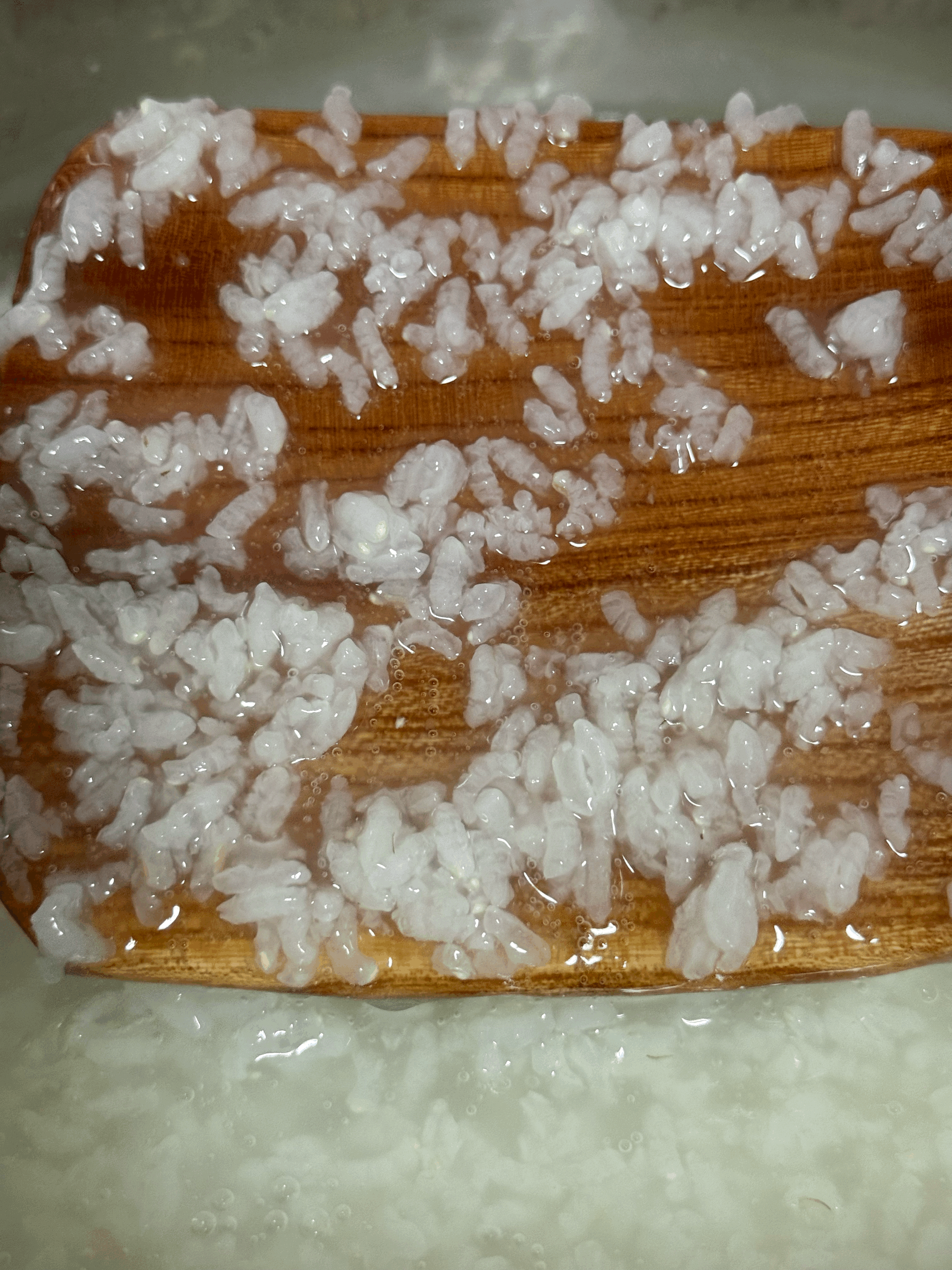 (+60분) 윗면의 고두밥을 먹어보니 멥쌀 고두밥 특유의 매우 꼬들꼬들한 식감이면서도 덜 익은 맛은 전혀 없이 잘 쪄 졌다. 하지만, 이번엔 멥쌀 고두밥 만으로 덧술을 하기 때문에 멥쌀의 호화도를 좀 더 높이기 위해 팔팔 끓는 물 4L를 부어 주고 강불로 10분간 뜸들임.